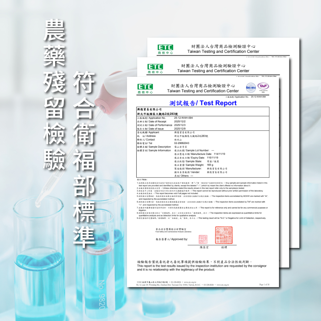 本產品已經ETC商檢中心之「農藥殘留410項」檢測,所有數值皆符合衛生福利部食品藥物管理署之規範。